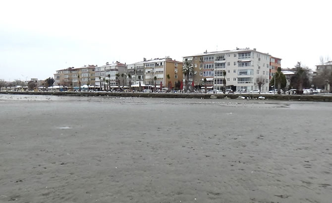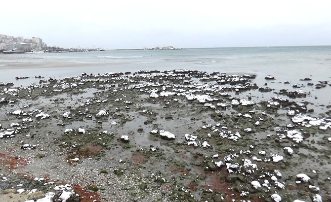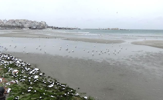 Silivri'de kar yağışı ile birlikte etkili olan fırtına nedeniyle deniz suyu yaklaşık 150 metre geri çekildi. Bu nedenle kum adası oluşurken, çöpler de ortaya çıktı.