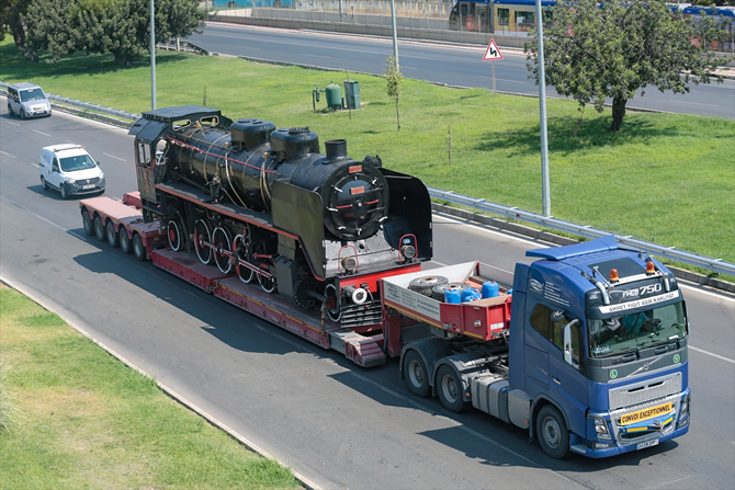 Demiryolu olmayan Antalya'ya zabıta eskortları eşliğinde özel bir tırda getirilen buharlı lokomotifin getirilişi ilgiyle izlendi. Lokomotif, Dokuma Park'ta gelecek günlerde sergilenmeye başlayacak.