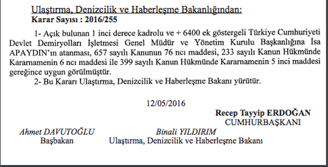 Türkiye Cumhuriyeti Devlet Demiryolları (TCDD) İşletmesi Genel Müdür ve Yönetim Kurulu Başkanlığına da İsa Apaydın atandı.