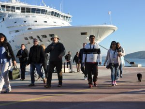 Gemiden inen turistler Meryem Ana Klisesi ile Efes Antik Kenti'ni ziyaret etmek amacıyla otobüslerle Selçuk'a gitti.