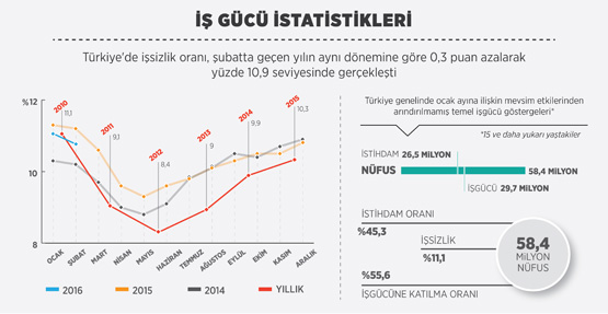 İstihdam edilenlerin sayısı, bu yıl şubatta geçen yılın aynı dönemine göre 880 bin kişi artarak 26 milyon 456 bin kişi, istihdam oranı ise 0,9 puan artarak yüzde 45,3 oldu.