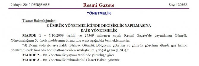 Yönetmeliğin, istisnai kıymetle beyana ilişkin hükmü düzenlenirken gümrük kıymetinin tespitinde, beyan sahibinin talebi üzerine, gümrük idaresince basitleştirilmiş usuller uygulanacak eşyalar listesine "Deniz yolu ile sıvı halde Türkiye Gümrük Bölgesi'ne getirilen ve gümrük gözetimi altında gaz haline dönüştürülerek limanda boru hattına verilen sıvılaştırılmış doğal gaz (LNG)" eklendi.