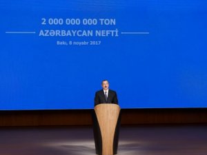 Azerbaycan'ın başkenti Bakü'de, ülkede bugüne kadar üretilen petrolün 2 milyar tona ulaşması dolayısıyla Haydar Aliyev Merkezi'nde düzenlenen törene Cumhurbaşkanı İlham Aliyev, SOCAR ve BP yetkilileri ile petrol endüstrisi çalışanları katıldı.
