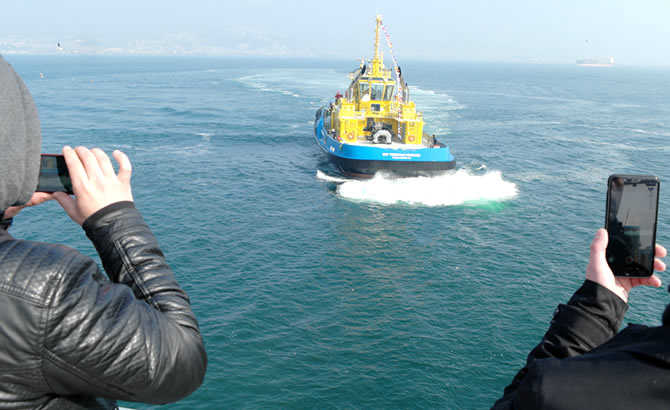 Kanada’daki AltaGas Terminali için yüksek standartlarda üretimi yapılan römorkör, tersane önünde törenin ardından katılımcılara kısa bir gösteri sundu. Nefes kesen gösteriyi birçok katılımcı cep telefonlarıyla kaydetti.