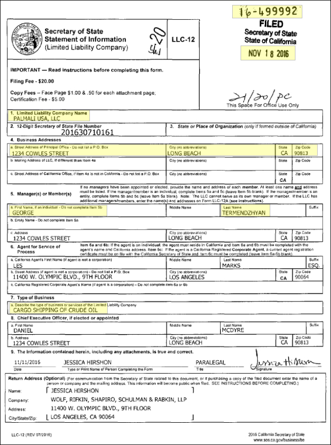 Kaliforniya Eyaleti Devlet Sekreterliği tarafından 18 Kasım 2016 tarih ve 16-499992 numaralı evrak numarasıyla kurulan PALMALI USA LLC Şirketinde, George Termendzhyan Genel Müdür olarak atandığı belirtilirken şirket merkezinin 1234 W Cowles St, Long Beach, CA 90813 olduğu kaydedildi.