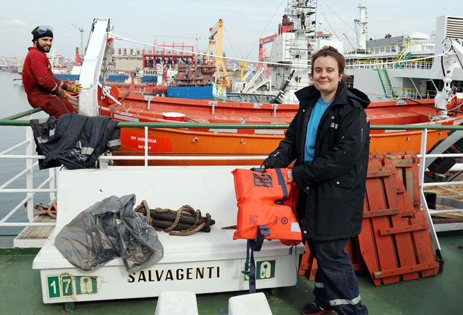 M/V HABIB NECCAR'ın mürettebatı ve dördüncü kaptanı Gülşen Zongür, gemiyi sefere hazırlamak için cansiparane olarak çalışıyor.